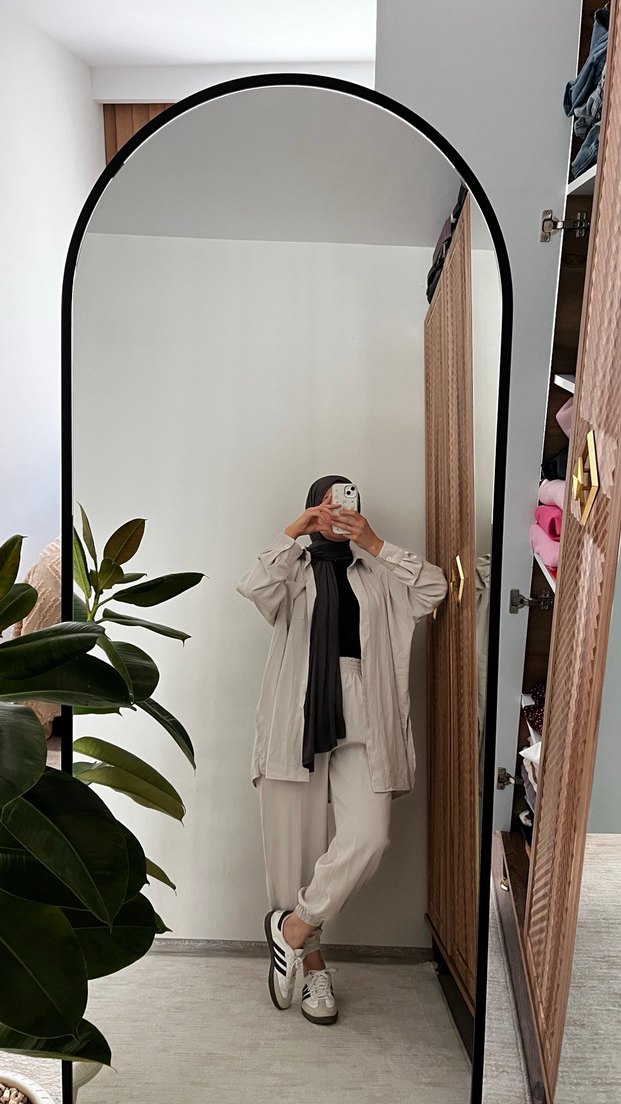 Bej Kadın Keten Takım Uzun Kollu