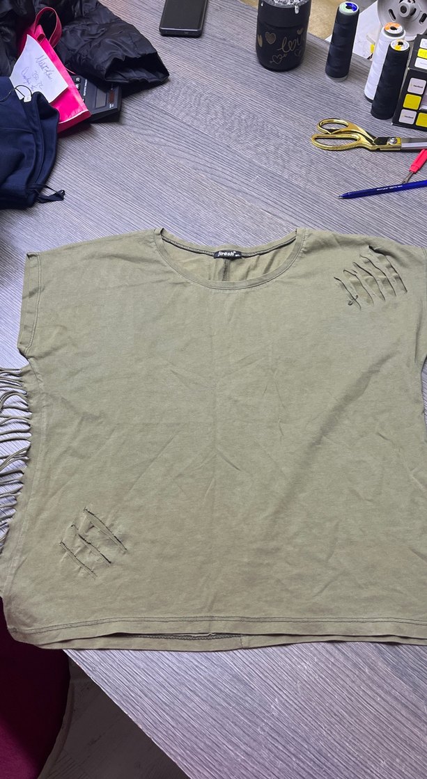 Bej renkli keten kadın tişörtü, yuvarlak yaka ve kısa kollu. Salaş kesimi ve küçük yırtık detayları ile rahat, günlük kullanım için uygun.