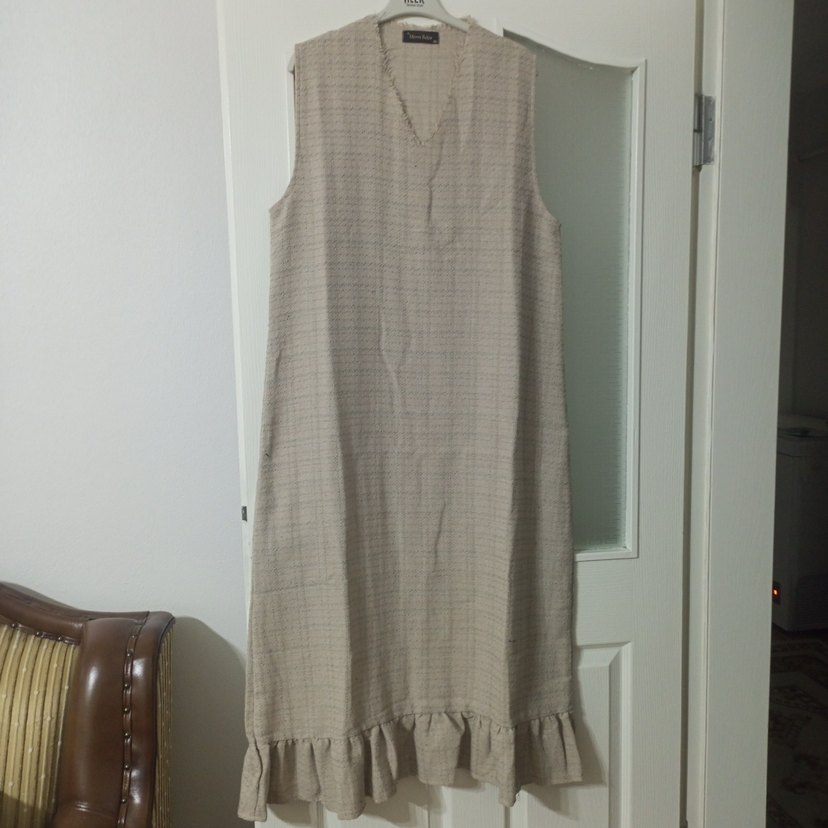 V yaka, kolsuz, keten bej uzun elbise. Salaş kesim, pilili ve fırfırlı etek ucu detaylı, minimalist tarzda günlük kullanıma uygun elbise.