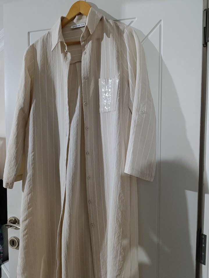 Bej keten uzun gömlek, bol kesim ve kısa kolludur. Yaka kısmı kesik detaylıdır ve düğmeli kapamalıdır. Hafif ve desensiz yapısıyla Paris sokak modasına uygundur.