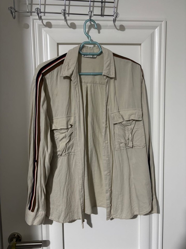 Bej renkli, keten kumaştan, uzun kollu, düğmeli ve yakalı kadın gömleği. Kollarda şerit detaylı, rahat kesim, günlük şehir stili için uygun.