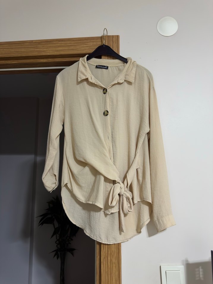 Bej keten uzun kollu, yakalı ve düğmeli gömlek. Salaş kesim ve belde bağlama detayıyla günlük kullanıma uygun.
