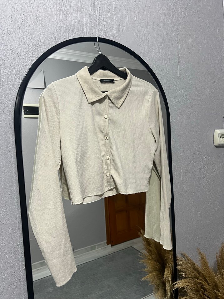 Bej keten uzun kollu, düğmeli, yakalı gömlek. Normal boy ve regular kesime sahip, günlük sokak stili için uygun.