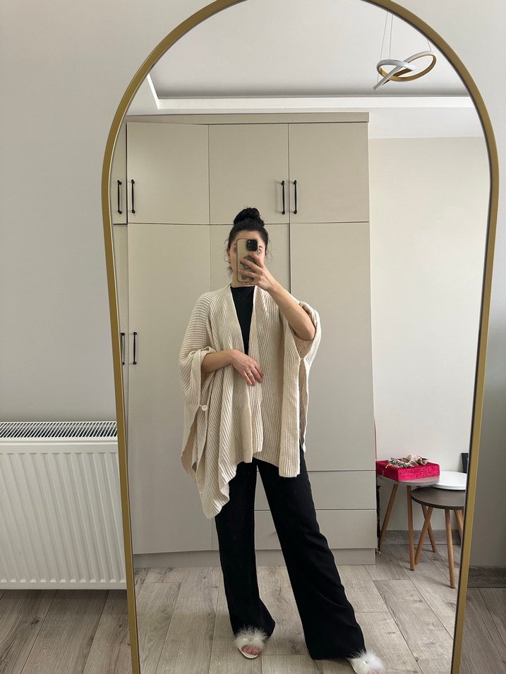Bej renkte, keten kumaştan yapılmış, uzun kollu ve loose fit kesime sahip kadın kimono. Yüksek yakalı ve midi boyda, rahat ve şık bir görünüm sunar. Desensiz tasarımıyla gündelik kullanıma uygundur.