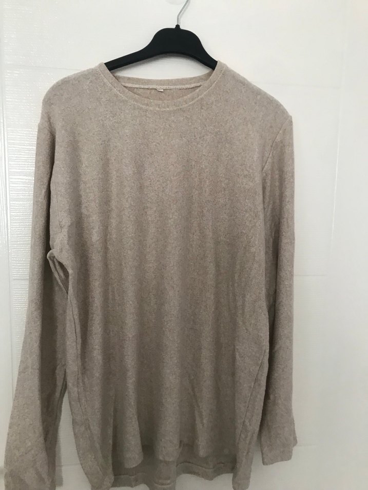 Bej renkli, keten kumaştan uzun kollu, yuvarlak yakalı kadın sweatshirtü. Bol kesimi ve sade deseniyle günlük rahatlık sağlar.