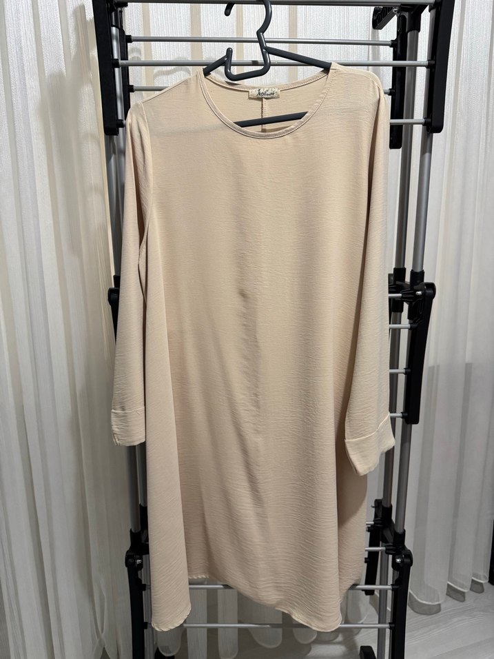 Bej renkli keten kumaştan, uzun kollu ve salaş kesime sahip, bisiklet yaka midi uzunlukta tunik. Minimalist ve sade tasarım, günlük kullanım için uygun.