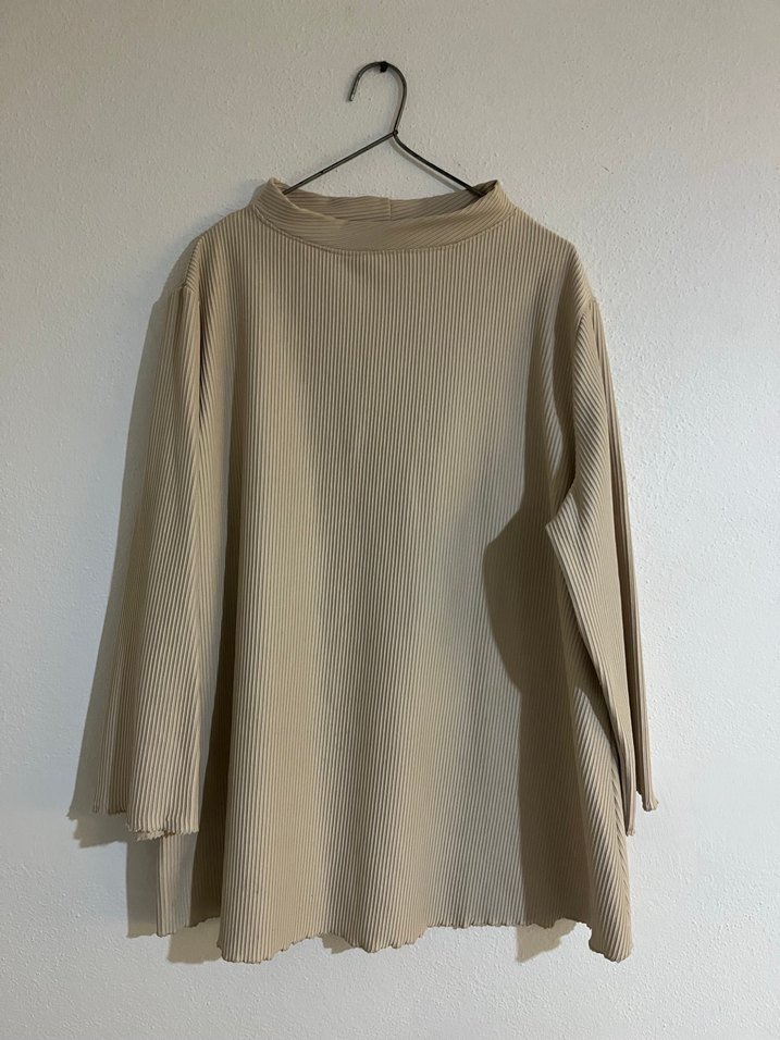 Bej keten kumaştan, uzun kollu ve yüksek yakalı, pileli detaylı, bol kesim kazak. Normal midi boyda, sade ve minimalist tarzda günlük kullanıma uygun. El dikimi bi üründür önünde lekeleri mevcut belirtildi