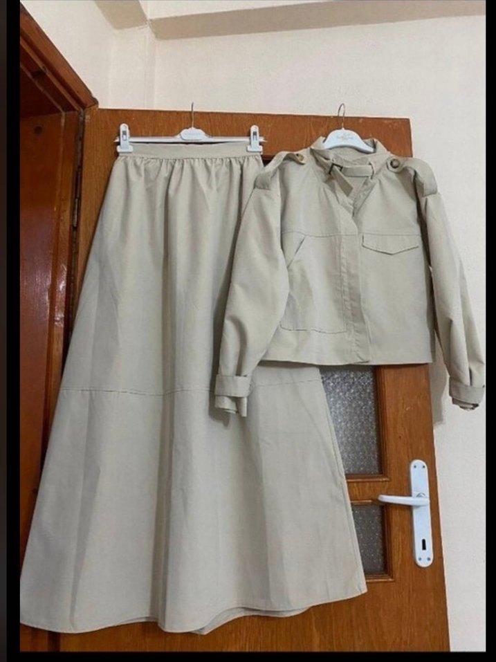Bej renkte, keten kumaştan uzun kollu, yakalı ve uzun etekli kadın takımı. Minimalist ve normcore tarzda, rahat kesim.
