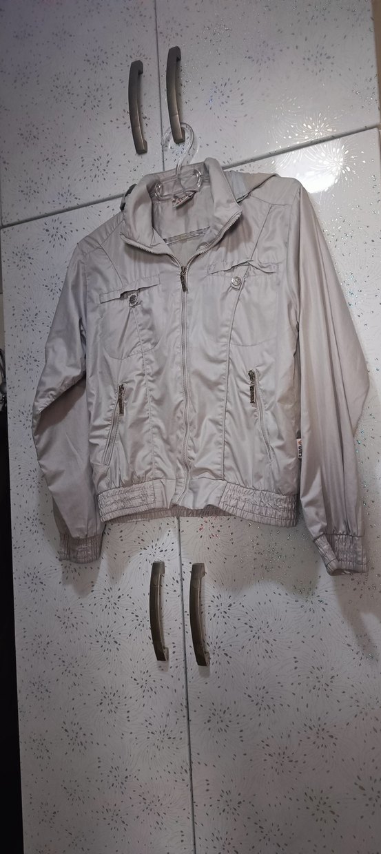 Bej renkli, fermuarlı ve uzun kollu kadın ceket, sentetik kumaştan olup bol kesim ve kısa boydadır. Notched lapel yakaya sahiptir.