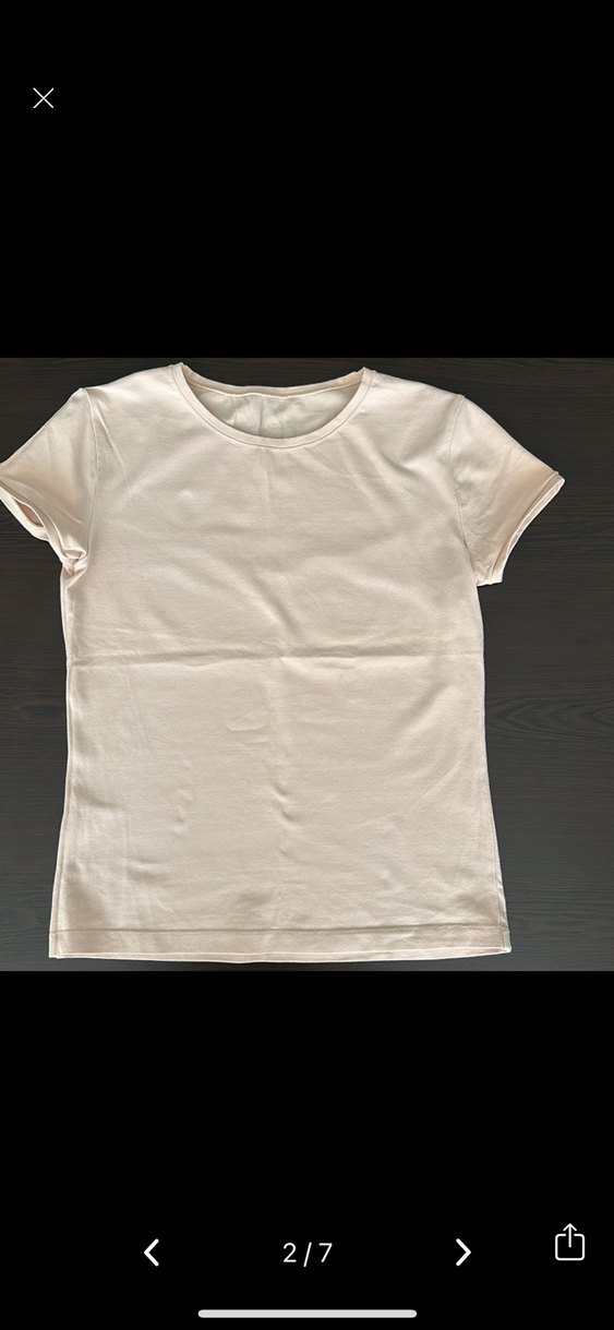 Bej renk, kısa kollu, yuvarlak yakalı, vücuda oturan kadın tişörtü. Yumuşak sentetik kumaştan, minimal ve normcore tarzda, günlük kullanıma uygun.iki kol arası 40 cm tişört boyu 50 cm. Rengi pudra renkte