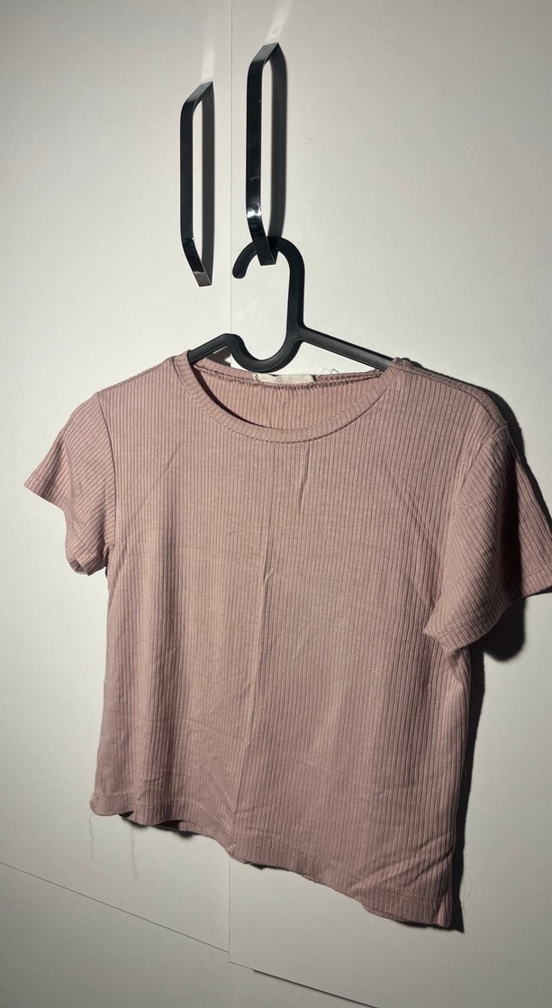 Bej renk, kısa kollu, bisiklet yaka ve ince kesimli kadın tişörtü. Yumuşak keten kumaştan, günlük kullanıma uygun sade ve şık bir tasarım.