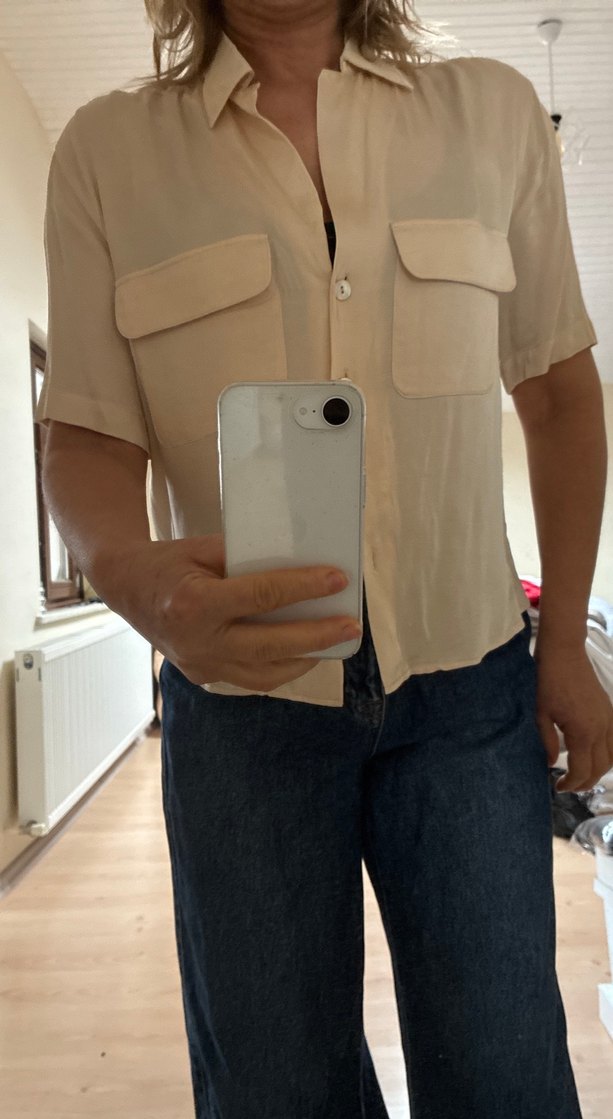 Bej renkli denim kumaştan, kısa kollu, yakası kesik ve düğmeli, rahat kesime sahip günlük kullanıma uygun gömlek.