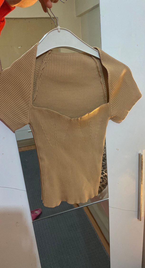 Bej renk, kısa kollu, yuvarlak yakalı, vücuda oturan kısa örgü kazak. Yumuşak sentetik kumaştan, günlük sokak stili için uygun.