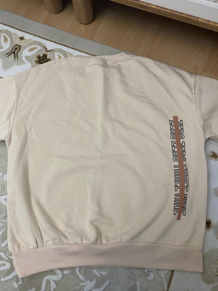 Bej renkli, kısa kollu, yuvarlak yaka kadın sweatshirtü. Gevşek kesimi ve baskılı deseniyle gündelik sokak stili için uygundur. Rahat sentetik kumaştan üretilmiştir.