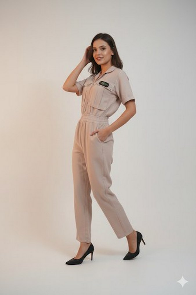 Bej renkli, kısa kollu ve kesik yaka detaylı tulum. Regular fit ve midi boyda, rahat ve şık bir günlük tercih. Düz ve yumuşak sentetik kumaştan.
