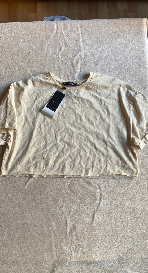 Bej renk,kumaştan, kısa kollu, yuvarlak yakalı, salaş kesim kadın tişörtü, günlük kullanıma uygun sade tasarım. Yaka kısmında az leke var yıkanınca gidecek bir leke