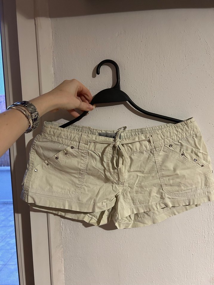 Bej renkli, pamuklu, bol kesim mini şort. Kemer detaylı ve desen içermeyen tasarımıyla rahat ve şık bir sokak stili sunar.