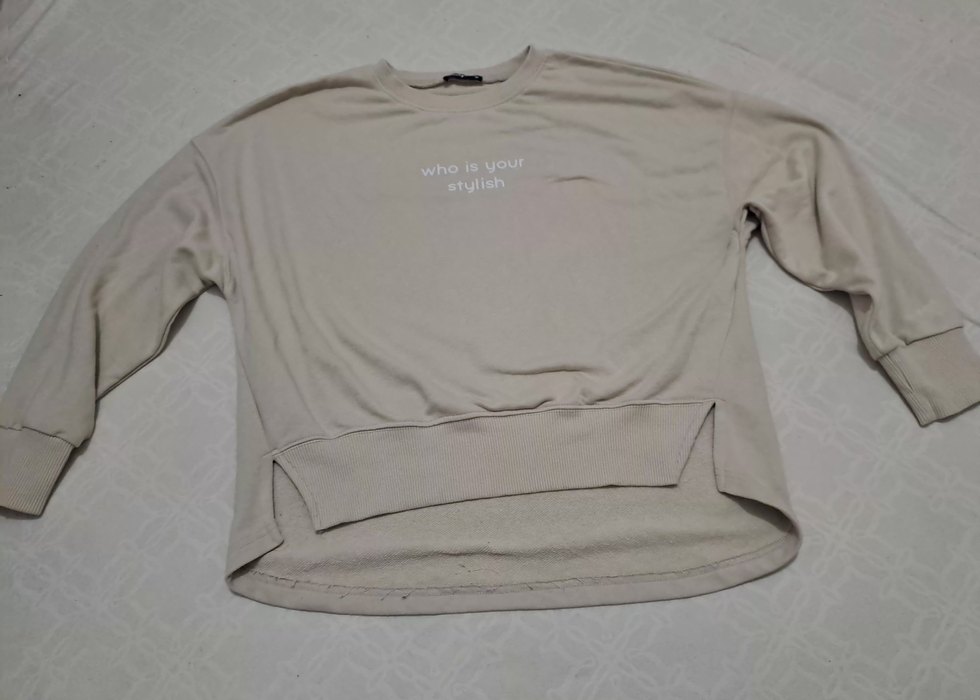 Bej renkli, uzun kollu, yuvarlak yakalı kısa sweatshirt. Rahat kesimli ve baskılı yazılı, günlük rahat tarz için uygun. Alt kısmında ufak bi renj farkı var.