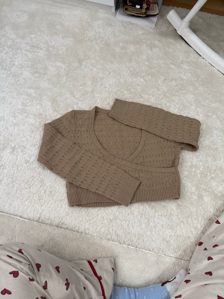 Uzun kollu, bej renkli, kısa kesim ve tek renk örgü triko kazak, sokak modasına uygun ve trend görünümlü.