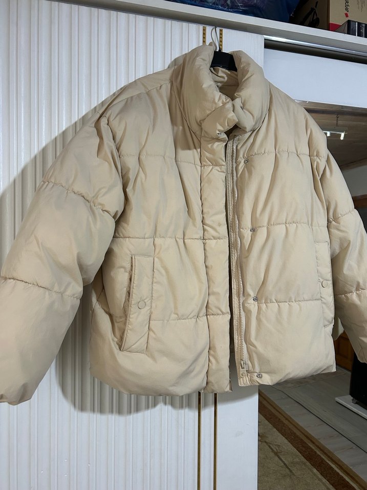 Bej renkli, yüksek yakalı, düğmeli kadın kış montu. Uzun kollu, bol kesim ve kısa boyda, yumuşak dokulu sıcak tutan kumaştan. İc tüylerinde toplanma vardır.