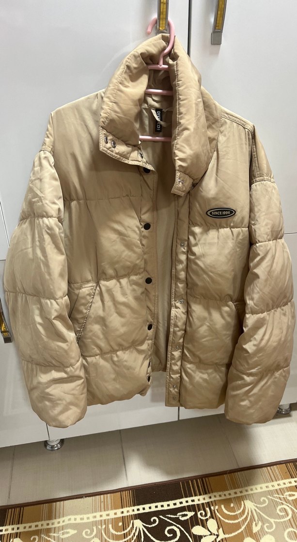 Bej renkli, düğmeli midi uzunlukta, bol kesim ve uzun kollu keten kumaştan kadın kışlık ceket. Parlak yüzeyli ve kesik yakalı, trend rahat stil için uygun.