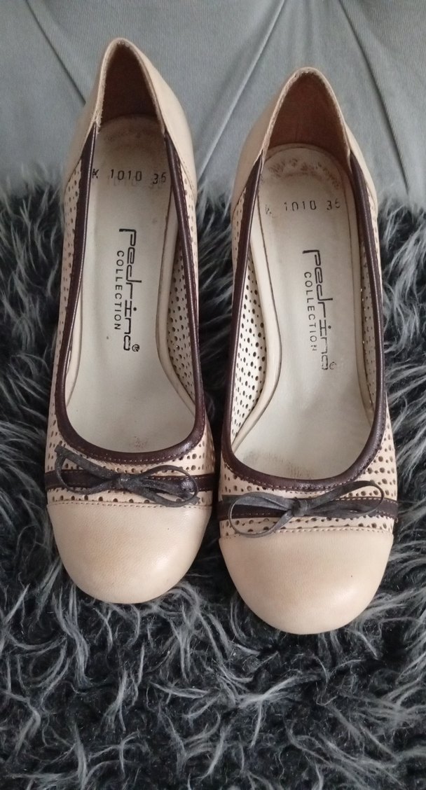 Bej renkli, dolgu topuklu kadın klasik ayakkabılar. Kauçuk malzemeden, tokalı ve desen içermeyen, günlük kullanıma uygun çağdaş tarzda.