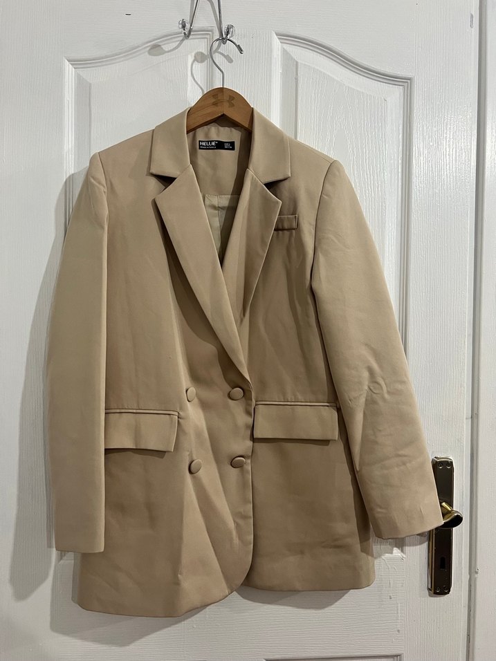 Bej renkte, keten kumaştan yapılmış, klasik kesim ve düğmeli ön kapamalı kadın ceket. Ofis ve günlük kullanım için uygundur. ✨