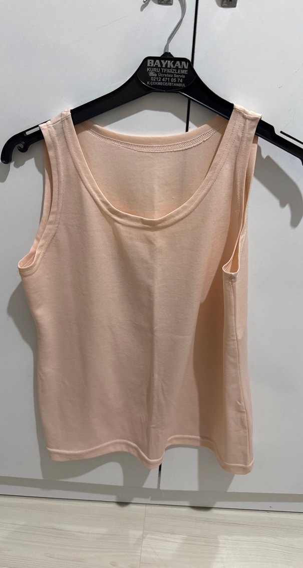 Bej renkli, kolsuz, yuvarlak yakalı ve bol kesim kadın atlet. Yumuşak sentetik kumaştan yapılmıştır ve gündelik kullanım için uygundur.