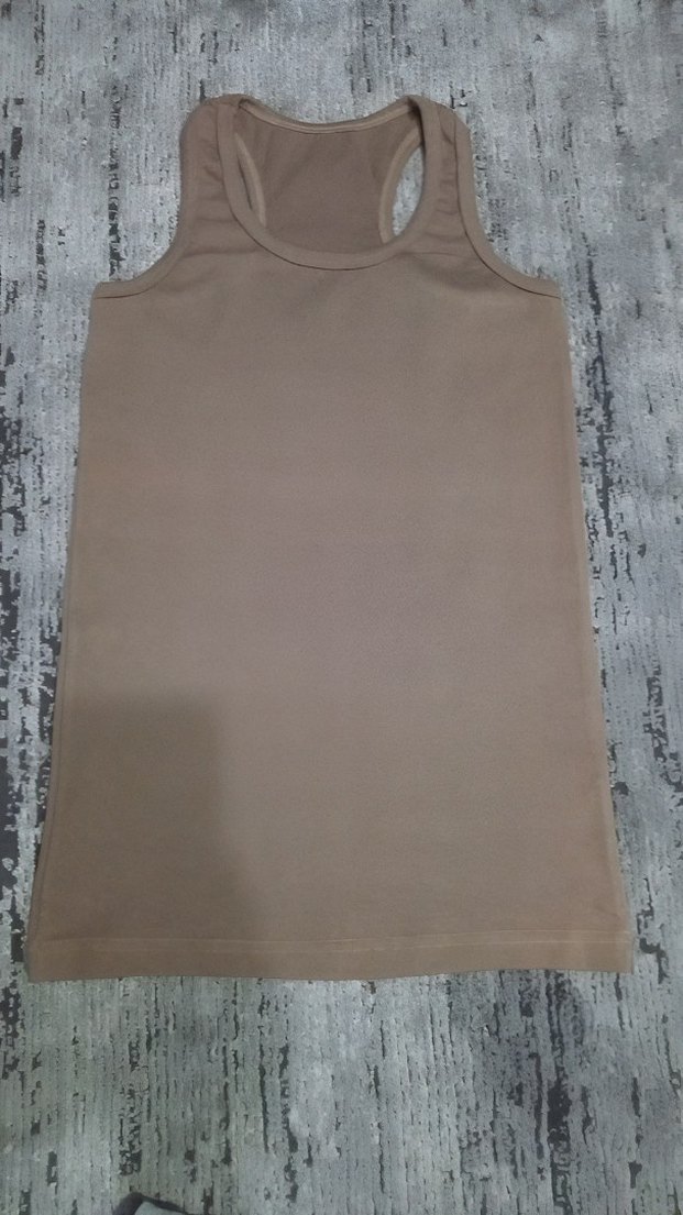 Bej renkte, kolsuz ve yuvarlak yakalı bu kadın atlet, düz ve vücuda oturan kesime sahiptir. esnektir.