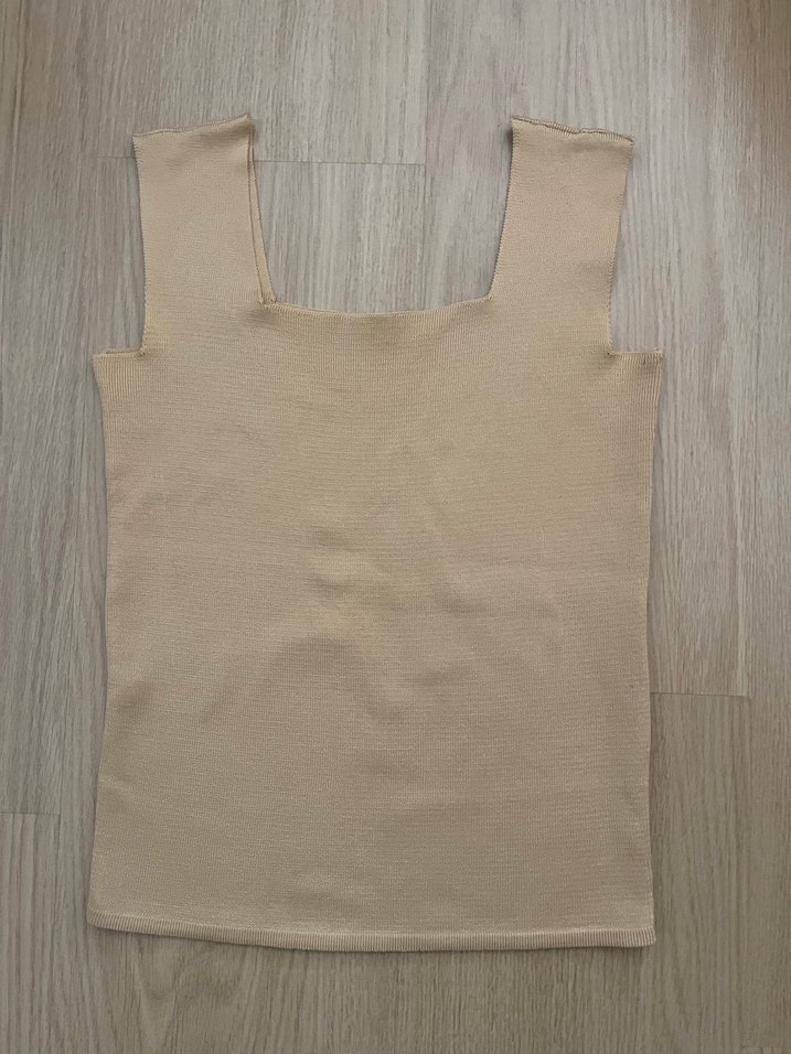 Bej renkli, kolsuz ve straplez kesime sahip, yumuşak sentetik kumaştan yapılmış, vücuda oturan basic kadın atlet. Minimalist tarzı ve normal midi boyu günlük kullanım için uygundur.