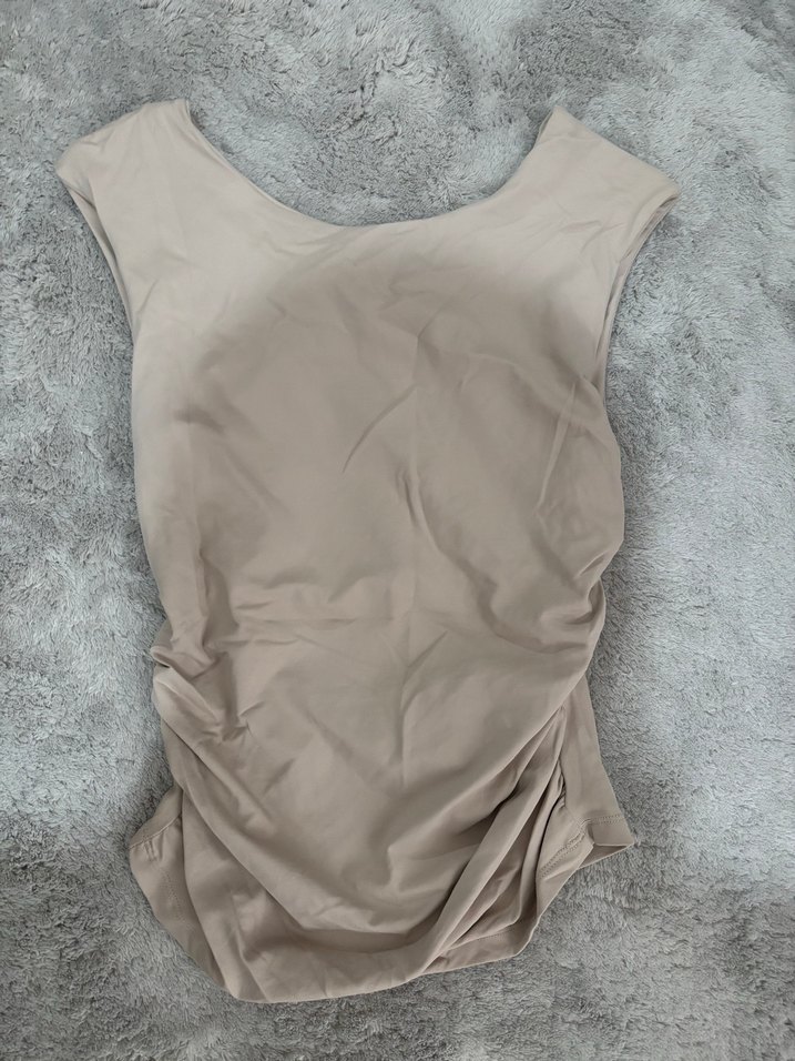 Bej renkte, kayık yakalı ve kolsuz kadın bluzu. Sentetik kumaştan, vücuda oturan kesimiyle dış mekan kullanımı için uygun. Arkası açıktır