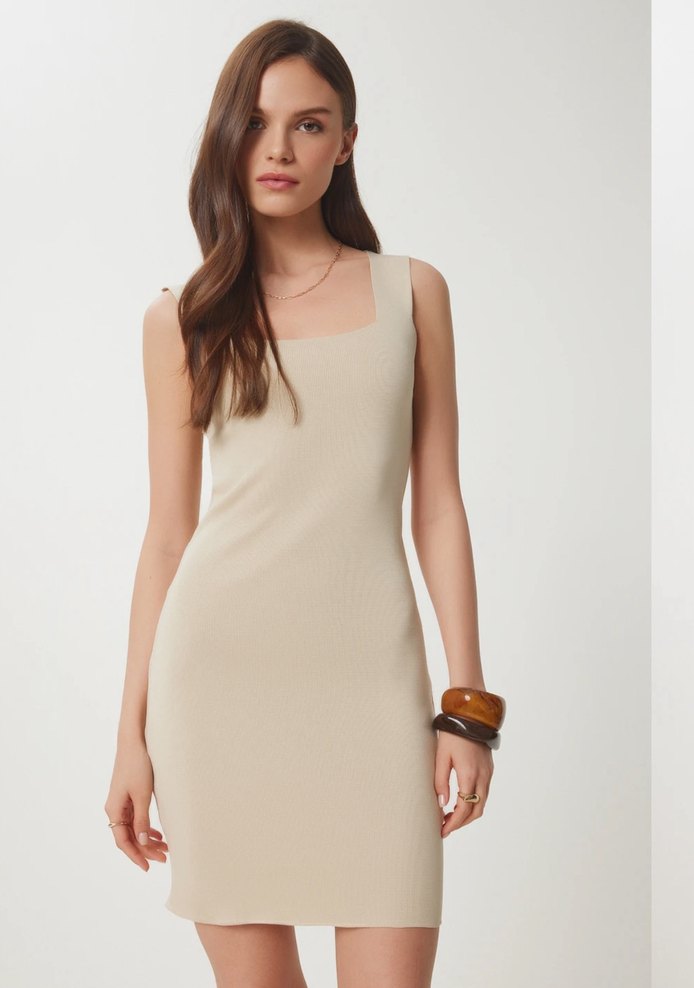 Kolsuz, tek renk bej triko elbise, tekne yaka ve vücuda oturan kesime sahip, günlük kullanım için ideal, satenimsi dokuda.s-m beden