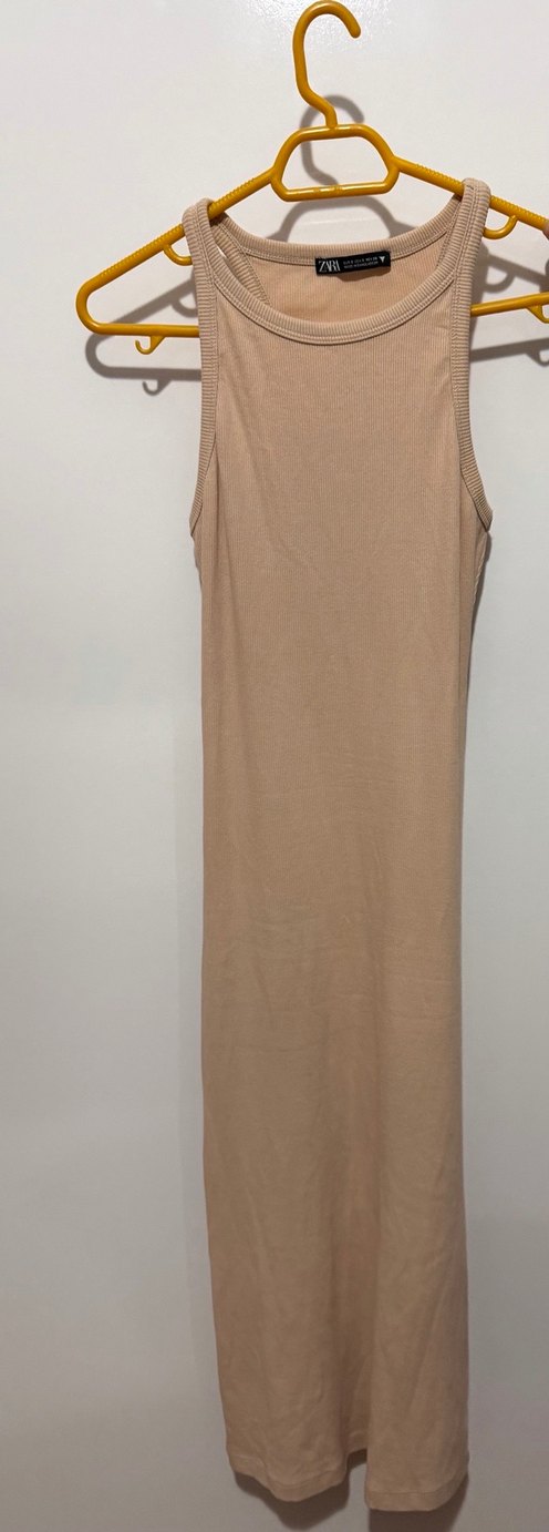 Bej renkte, kolsuz ve uzun kesimli bu elbise, yüksek yakalı ve vücuda oturan tasarıma sahip. Düz, sade ve sentetik kumaştan üretilmiştir.