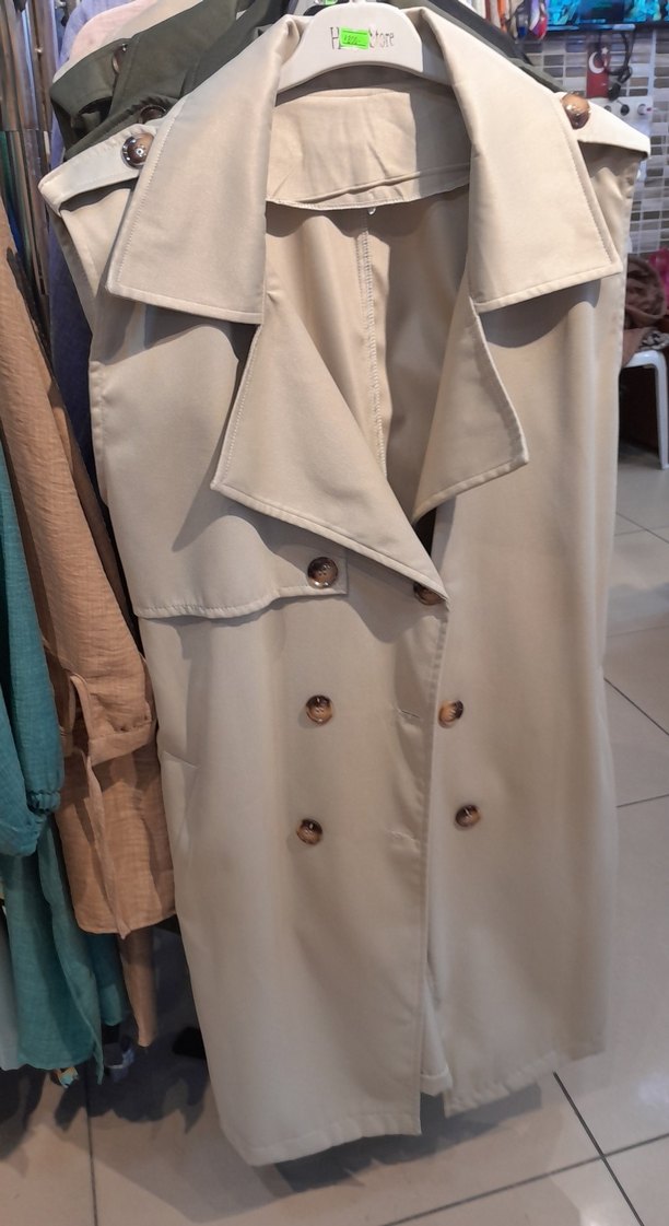 Bej renkli, kolsuz, uzun kesim trençkot, düğmeli ve klasik yaka detaylıdır. Rahat kalıplı ve sentetik kumaştan üretilmiştir.