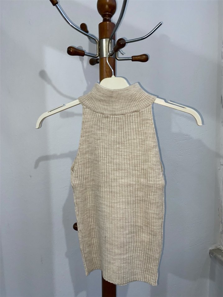 Bej Kadın Kolsuz Yarım Boğazlı Örgü Süveter