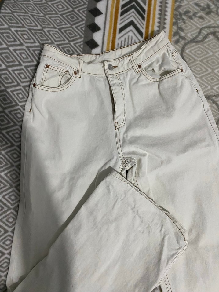 Beyaz, pamuklu, bol kesim ve midi boy kadın kot pantolon, minimalist ve desensiz tasarımıyla günlük kullanıma uygundur.