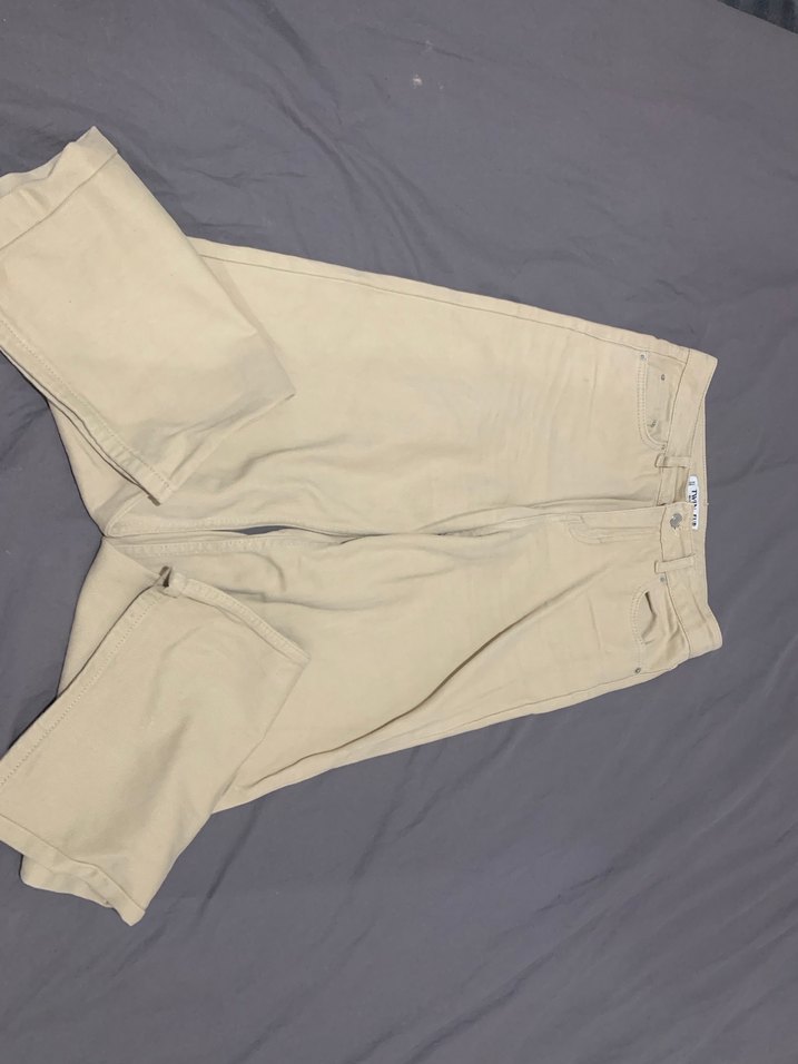 Bej renkli, pamuklu, kot pantolon. Minimalist sokak stili için uygun, günlük kullanımda rahatlık sağlar.