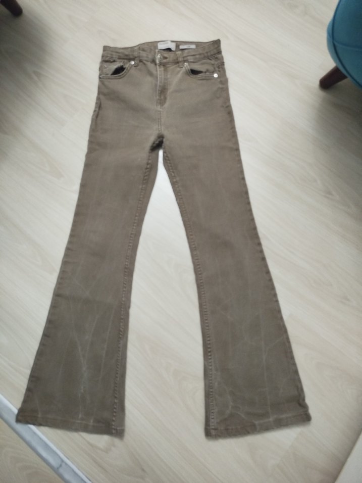 Bej kadın kot pantolon, düz ve desen içermeyen tasarımıyla günlük kullanıma uygun, normal boy ve rahat kesim sunar. pantolon paçaları İspanyol tarzıdır. rengi taş rengi koyu bej.