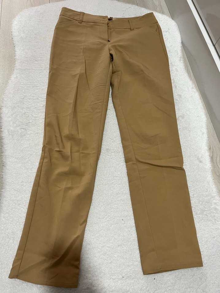 Düz bej renkte, normal boy midi kumaş pantolon. Rahat kesimli ve parlak kumaştan, ofis ve günlük kullanıma uygun. ✨
