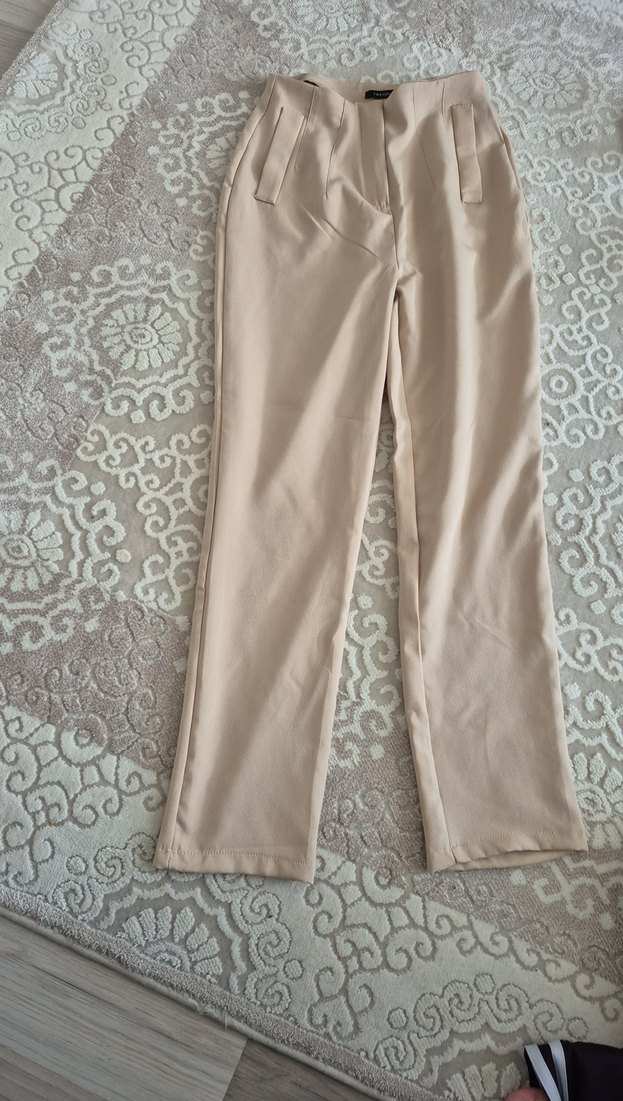 Bej renkli, midi boy kadın kumaş pantolon, rahat kesimi ve sentetik kumaşıyla günlük sokak stiline uygun.