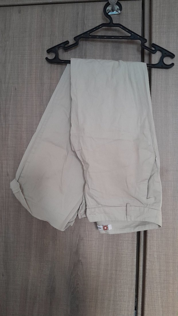 Bej keten, düz ve rahat kesim kadın kumaş pantolon, günlük kullanıma uygun şık ve sade bir modeldir. Dusuk beldir