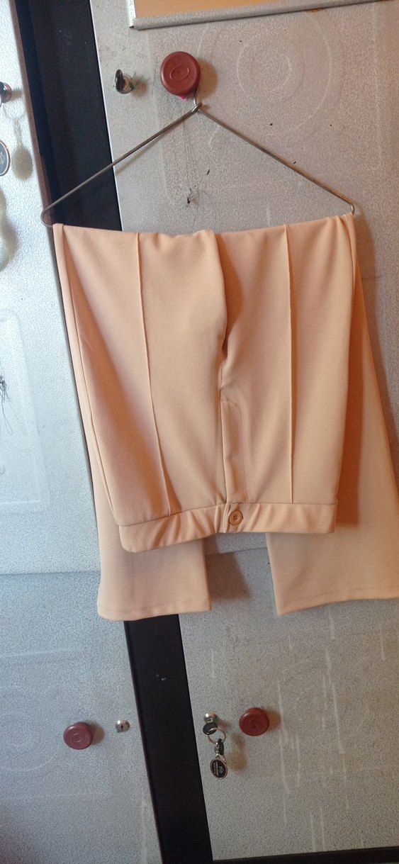 Düğmeli, bej midi boy kadın pantolon. Düz, sentetik kumaştan, normal kesim, ofis için uygun, minimalist tarzda.kusuru yoktur