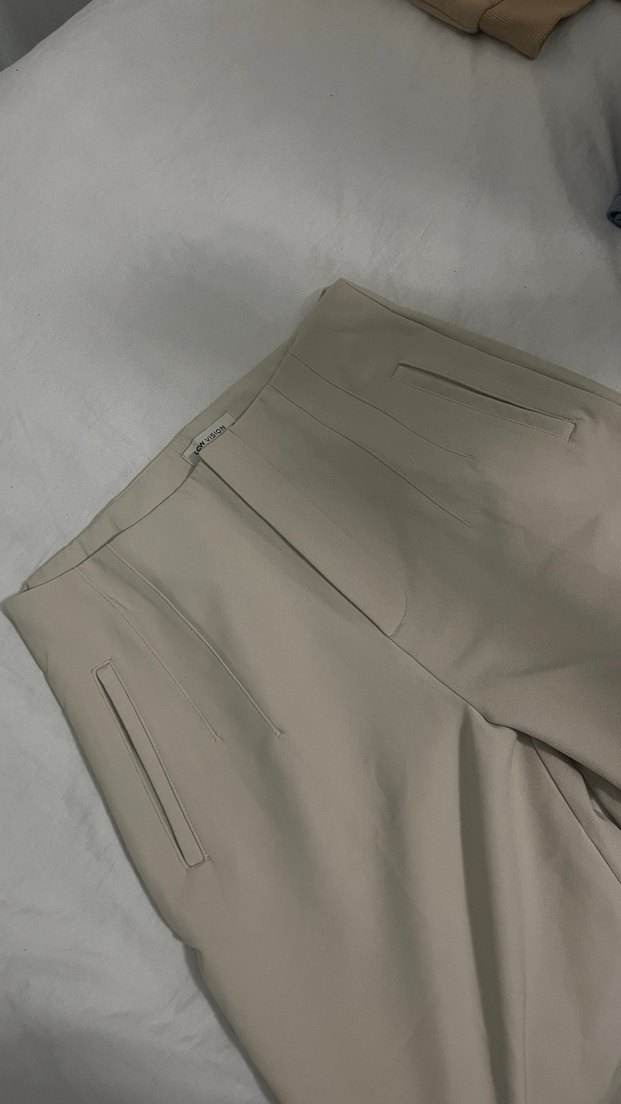 Bej renkte, düz desenli, normal kesim ve midi boy kadın kumaş pantolon. Sentetik yumuşak kumaştan, minimalist ve normcore tarzda, ofis için uygun şık tasarım.