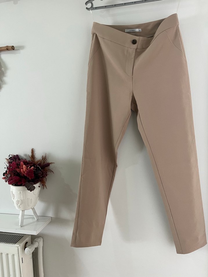 Bej renkli, kadın kumaş pantolon. Yumuşak sentetik kumaştan üretilmiş, minimalist ve normcore tarzda, ofis için uygun. Pastel ton ve desensiz tasarımıyla zahmetsiz şıklık sunar.
