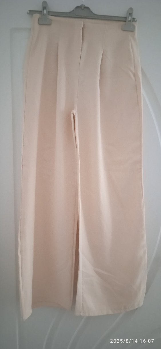 Bej regular kesim, pileli kadın kumaş pantolon. Ofis için uygun, ipeksi dokulu, minimal ve sade tarzda.