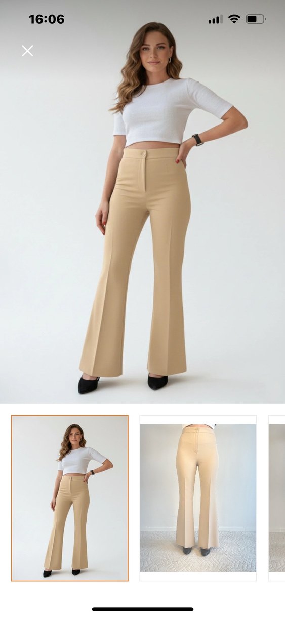 Bej renkte, midi boy, regular fit kumaş pantolon. Sentetik kumaştan üretilmiş, şık ve çağdaş ofis stiline uygun.