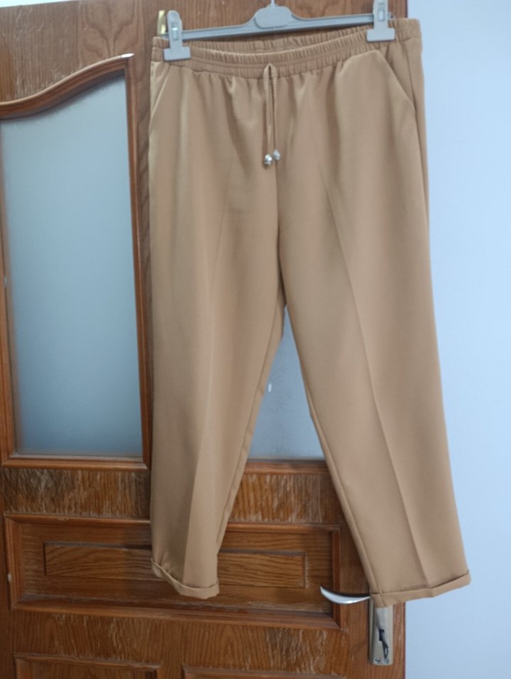 Bej renginde, kemerli, midi boy kadın kumaş pantolon. Minimalist sokak stiline uygun, yumuşak sentetik kumaştan, günlük kullanım için ideal.