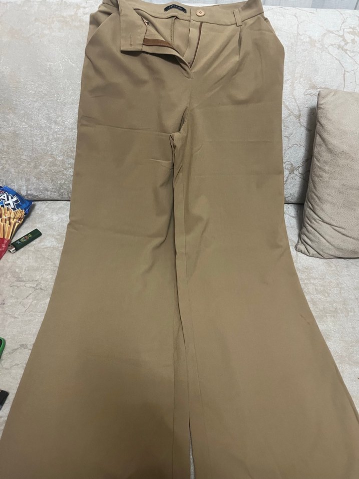 Bej renk, kemerli, uzun paça kadın kumaş pantolon. Rahat kesimi ve yumuşak sentetik kumaşıyla iş ortamı için uygundur. 36 beden