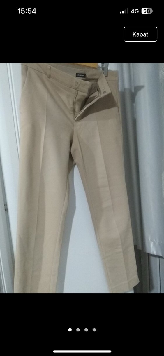 Düz bej kumaş pantolon, midi boy ve regular fit. Ofis ve günlük kullanıma uygun, rahat ve şık görünüm sağlar. Sadece iki kez giyildi kusursuz