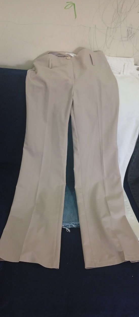Bej renkli, regular fit kesim ve midi boyda kadın kumaş pantolon. Düz desensiz, ofis için uygun rahat ve şık tasarım. ve boyfrend pantolonlar da var hepsi yeni 1yada2 kez giyildi kilo aldığım için satıyorum